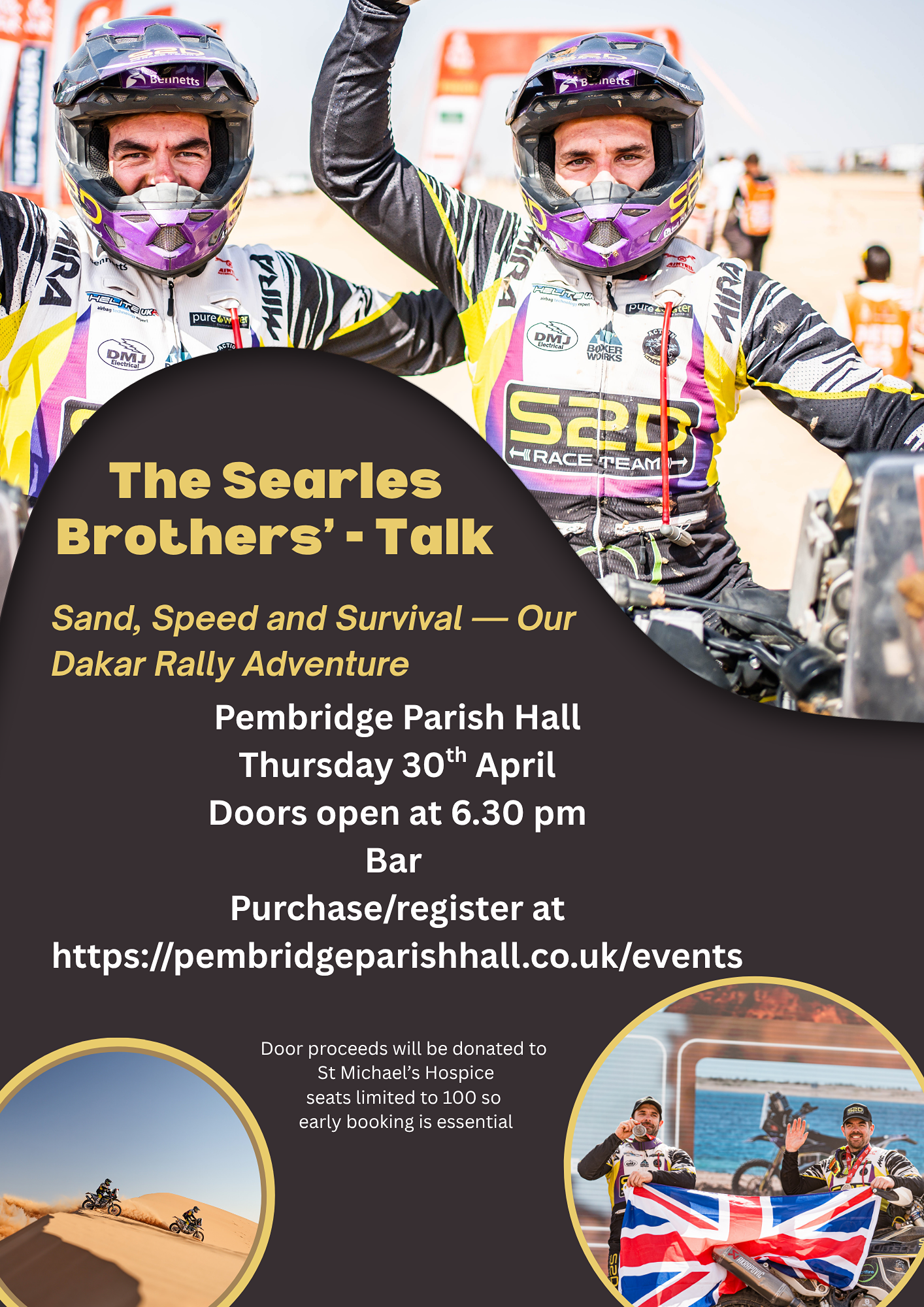 When the flag finally dropped, they found themselves pitting their abilities against the world's finest off-road riders across thousands of kilometres of punishing desert terrain. Over 10 to 15 gruelling days, through sand, rock and extreme conditions, they pushed themselves and their machines to the absolute limit. Come along to the village hall to hear them tell their remarkable story in their own words — a tale of brotherhood, resilience and one of the greatest adventures in motorsport.